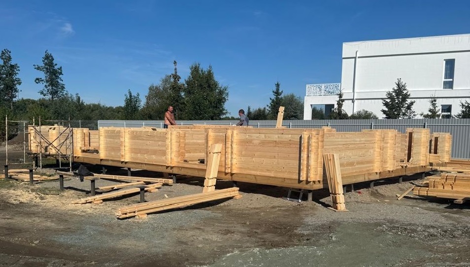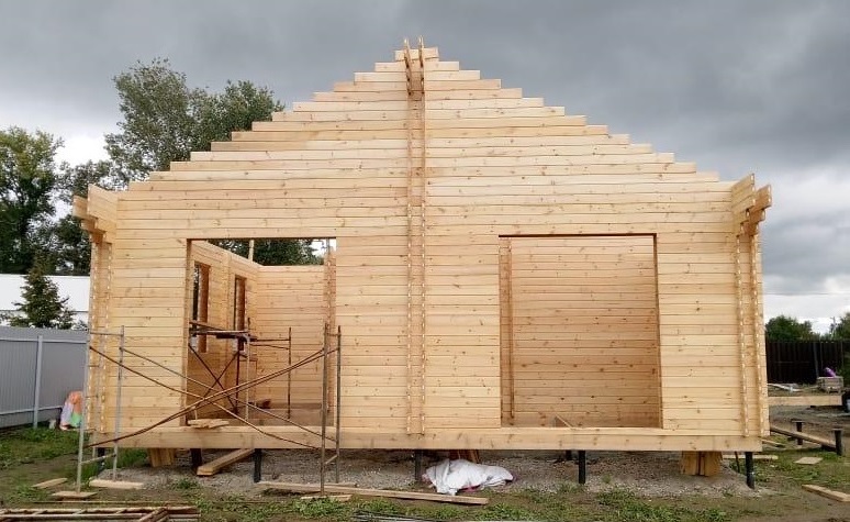 Сформированы фронтоны и проёмы; контур стен завершён, площадка готовится к монтажу балок перекрытия и стропильной системы.