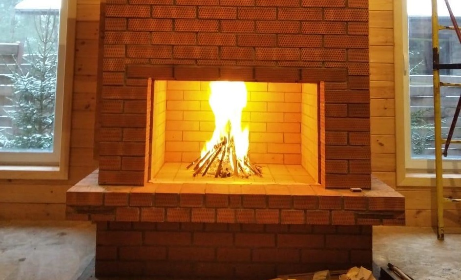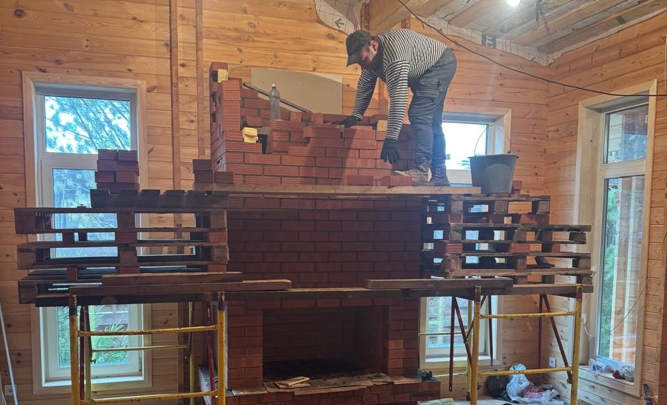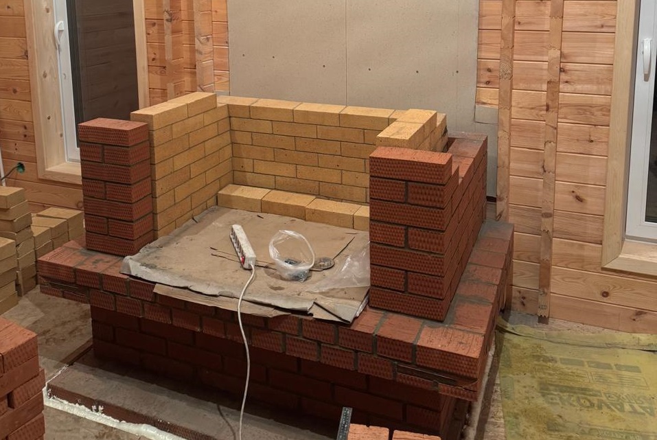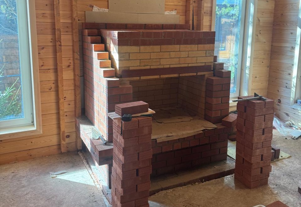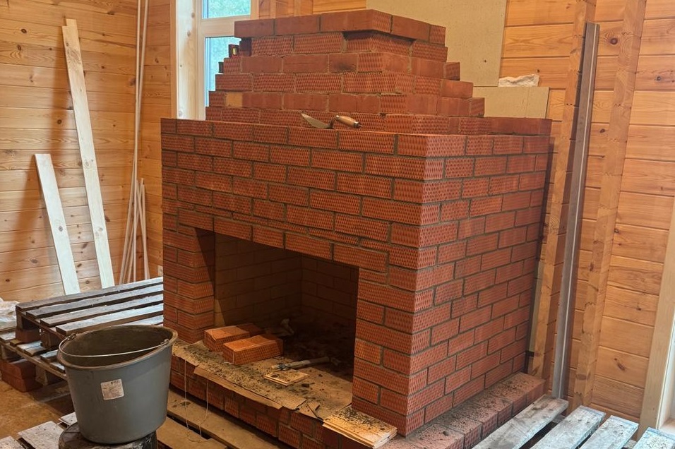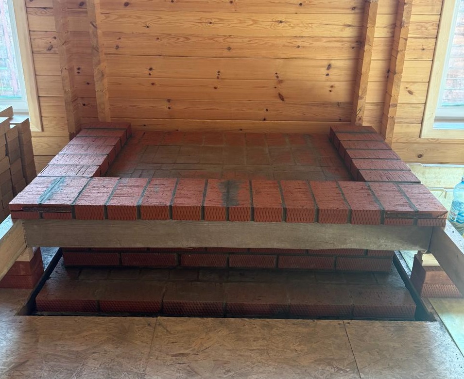 В коттеджном поселке «Лаки Парк» выполнили полный цикл устройства кирпичного камина в деревянном доме: независимое основание, экран с вентзазором, шамотная топка, корректные узлы проходов и проверенный дымоход.