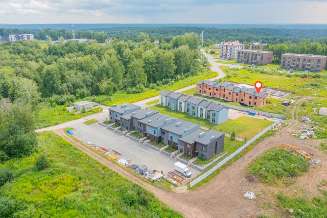 Таунхаус имеет два выхода: – один на улицу с парковкой, второй – на комфортный двор, изолированный от машин. Большие панорамные окна. Материал стен - кирпич.