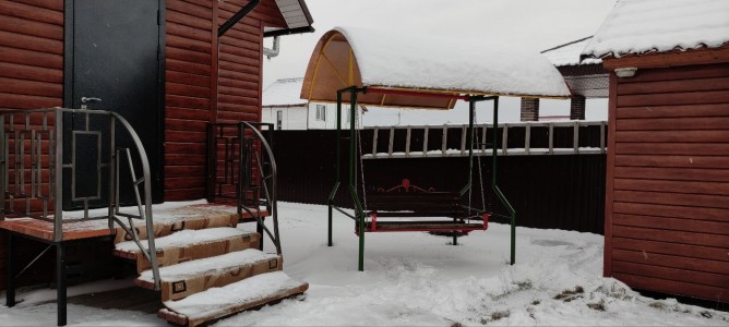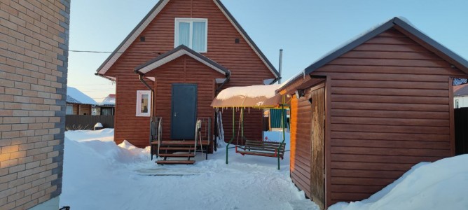 2. Гостевой двухэтажный дом из бруса 6*6, площадью 56 м2, полностью жилой, очень теплый. Ленточный фундамент, наружний брус 200*200 + утеплитель + сайдинг, внутри стены отделаны вагонкой. Смонтирован переливной септик, объёмом 7 м.куб.