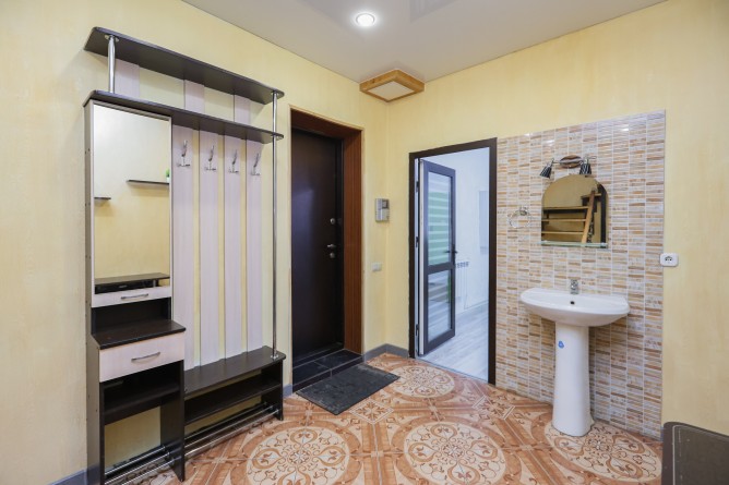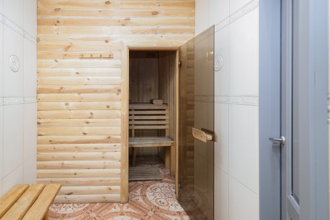 На пером этаже, находится просторная прихожая, детская спальня, жаркая сауна, душевая и санузел.