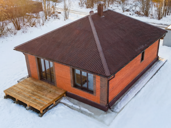 Крыша четырехскатная вальмовая с металлическим водостоком, кровля – ондулин – черепица с утеплением базальтовыми минерало-ватными теплоизоляционными плитами 200 мм.