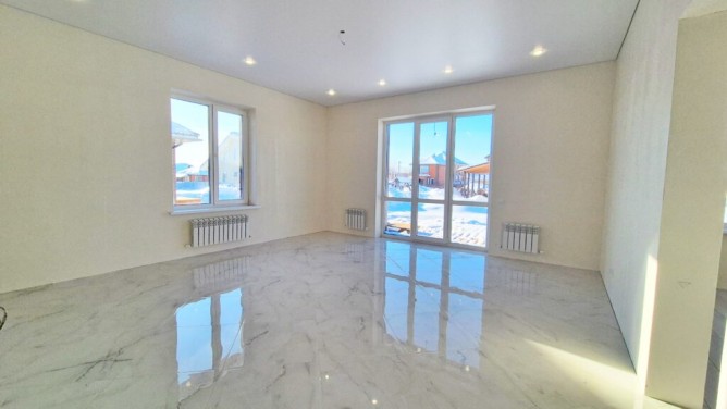 Потолок — по деревянным балкам подшит плитой ОСП-3 Kronospan 9 мм, натяжные потолки во всех помещениях, кроме котельной, в комнатах сделаны выводы под люстру; в прихожей, коридоре, кухне-гостиной установлены 22 точечных светильника, в каждой комнате закладные для крепления карнизов