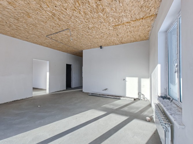 Поток: натяжные потолки во всех помещениях, кроме котельной, в комнатах сделаны выводы под люстру; в прихожей, коридоре, кухне-гостиной установлены 22 точечных светильника, в каждой комнате закладные для крепления карнизов