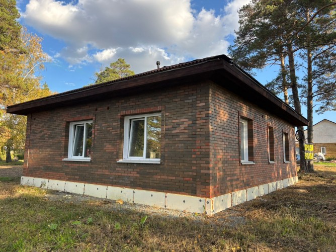 Общая площадь дома: 85 м2, фундамент: монолитная утеплённая плита(толщина: 270 мм.). Состав стен: (облицовочный кирпич 140 мм., утеплитель: 100 мм. Сибит: 200 мм. вентиляционный зазор 20 мм.) общая толщина стен: 460 мм.(46 см.). В каждой комнате установлены пластиковые окна, в кухне-гостинной установлены 2 "французких окна" от пола с открывающейся дверью. Кровля – ондулин, перекрытие чердака утеплено мин.ватой: 150мм, пол – полусухая стяжка.