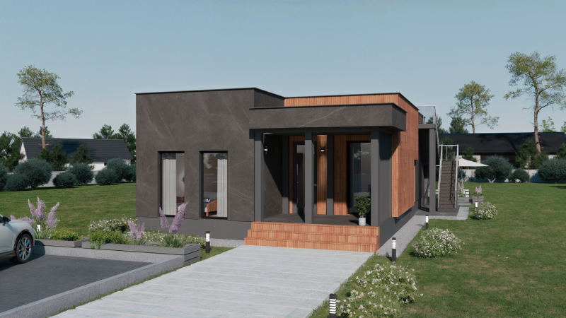 Деревянный одноэтажный дом с эксплуатируемой крышей из 7 модулей. 2 террасы- по 11 м2. Панормное остекление. Внутренняя отделка white box. Лестница на крышу снаружи дома. Есть тех. помещение. Стильный дом для современной семьи, которая ценит комфорт и эргономику.