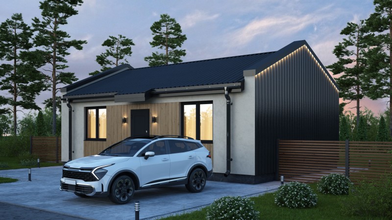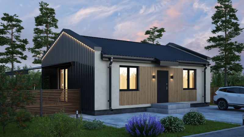 Компактный функциональный одноэтажный дом с оригинальным фасадом и двухскатной кровлей. Имеет две спальни, кухню гостиную с выходом на задний двор, котельную-постирочную, второй санузел можно разместить в котельной постирочной.