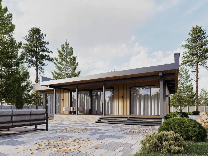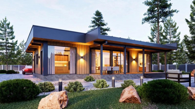 Дом FLAT — это просторный и красивый одноэтажный дом в современном стиле с высокими потолками и панорамным остеклением во всех комнатах.
