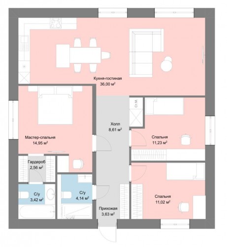 Следуя современным трендам в малоэтажном домостроении мы рады предложить альтернативное планировочное решение данного проекта с увеличенной кухней -гостинной (36 кв.м.), имеющей 2 французских окна, а также мастер — спальней с собственным с/у, гардеробной, мейкап — зоной.
