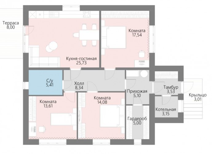Эргономическая – помимо прихожей в помещении тамбура располагается тепловой пункт со всем инженерным оборудованием, а значит внутри дома можно организовать просторную гардеробную комнату или дополнительный с/у, а при желании и то и другое, превратив смежную комнату в мастер – спальню.