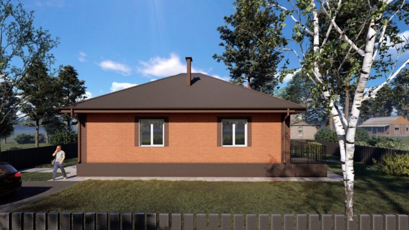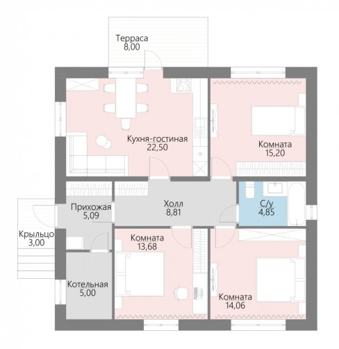 Данный вариант проекта предполагает наличие в доме тамбура-прихожей (5 кв.м.), котельной (4 кв.м.), кухни-гостиной (22,5 кв.м.), санузла с окном (5 кв.м.), трех жилых комнат (15, 2 кв. м., 14,7 кв. м. и 13,8 кв.м.).