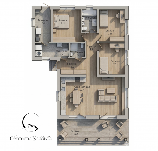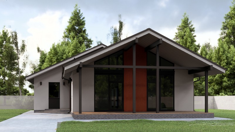 В проекте предусмотрены три спальни, просторная кухня-гостиная и два санузла. В доме главный вход смежен со входом в прачечную, также предусмотрена дверь с улицы в котельную, через которую можно пройти в прачечную и далее внутрь дома. В кухне-гостиной присутствуют понорамные окна с выходами на просторную крытую террасу.