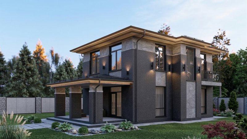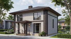Проект современного двухэтажного дома квадратной формы с вальмовой четырехскатной кровлей.