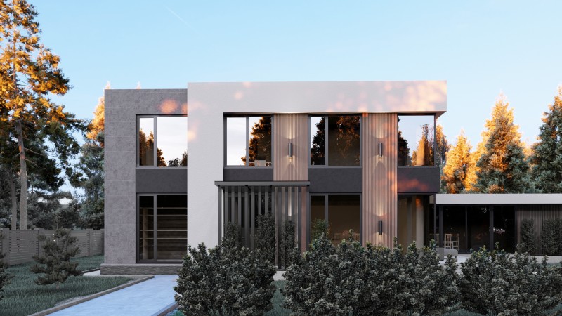 Проект современного загородного дома в стиле хай-тек с плоской кровлей и вентилируемым фасадом из декоративных фиброцементных плит (японская панель).