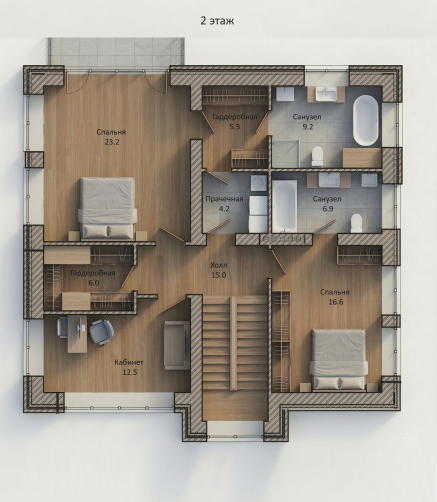Второй этаж жилая приватная зона: две мастер-спальни, одна из которых имеет балкон, рабочий кабинет, прачечная и общая гардеробная.