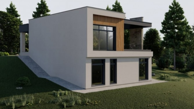 Двухуровневый дом на склоне с видовыми характеристиками на чащу леса. Газ, вода, электричество, асфальтовая дорога, автономный септик - включены в стоимость.