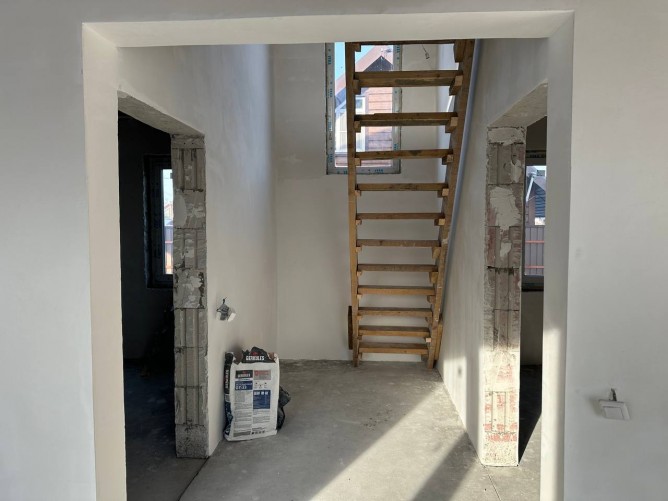 Сделана чистовая отделка White box: оштукатурены и зашпаклеваны стены, сделана разводка воды, вентиляция в санузлах и кухонной зоне. Пол на первом этаже - полусухая стяжка, на втором - черновой деревянный.