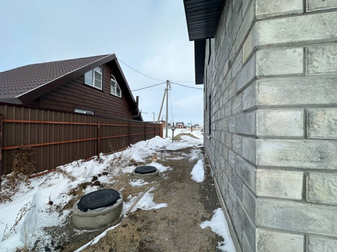 Дом построен из теплоблоков. Большие теплые пятикамерные пластиковые окна Veka с двойным стеклопакетом, мультифункциональными стеклами (с защитой от солнца) и немецкой фурнитурой. Два входа - на дорогу и на участок. Можно пристроить террасу.