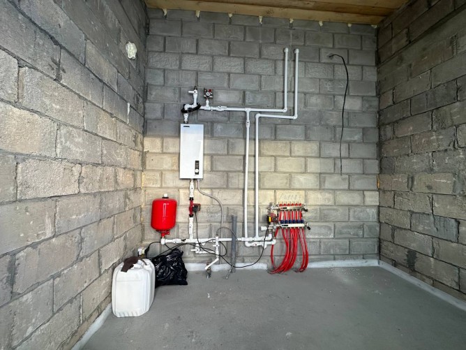 Отопление - электрокотел, теплый пол на первом этаже, на втором этаже радиаторы под окнами. По границе участка проходит газ. Подведение газа к участку оплачено, можно подключать.
