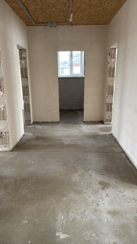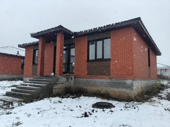 Одноэтажный дом 100м2 из 400мм Газобетона, облицовка кирпич на ленточном фундаменте. В дом заведены все необходимые для жизни коммуникации: Водоснабжение централизованное (скважина КП). Электричество разведено по дому. Отопление электрокотел с разводкой теплого пола по всему дому. Газ расположен по границе земельного участка. В предчистовой отделке.
