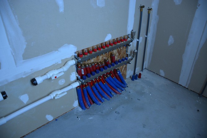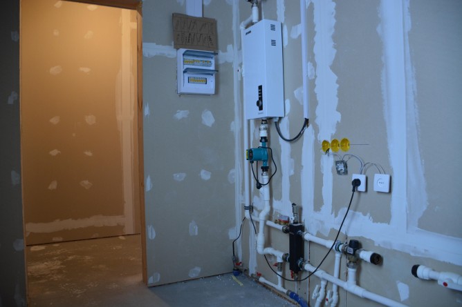 Отопление дома – теплые водяные полы и батареи ( электро котел, газ по участку )