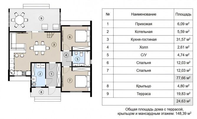 Площадь дома с террасой и крыльцом 148,39 кв.м.