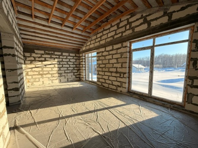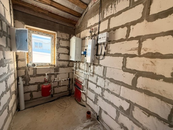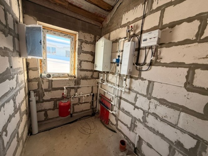 Фундамент - плита УШП, материал стен Сибит (газобетон) 400 мм ( плотность D500), отопление газовый котел + электрокотел (резервный), теплый пол.