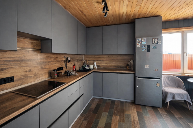 Кухня была выполнена под заказ, с использованием дорого встроенной техники.