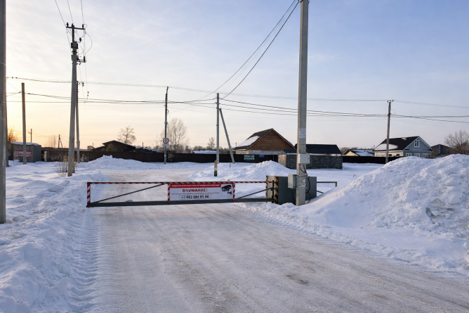 Территория СНТ окружена забором, въезд через автоматический шлагбаум, обеспечивающий безопасность и уединение.