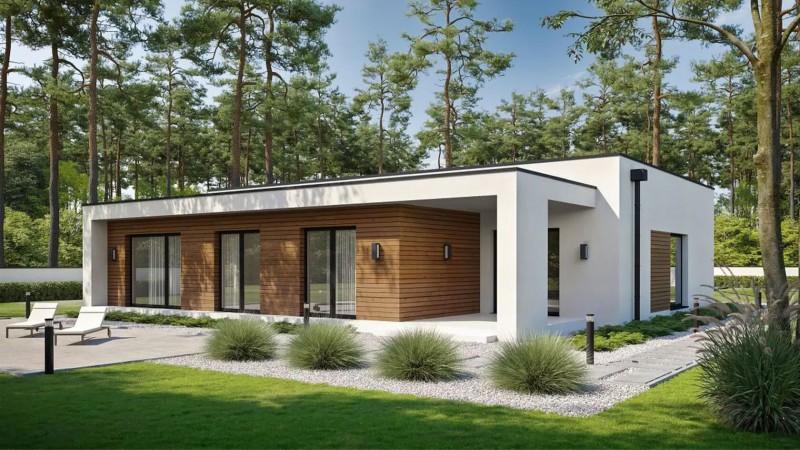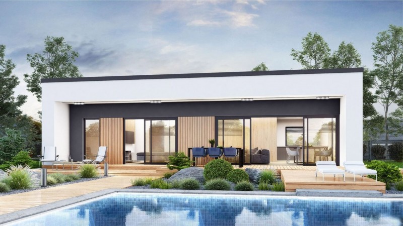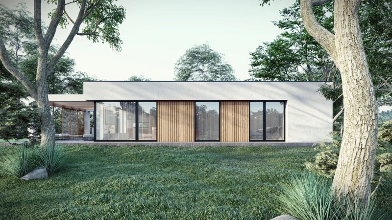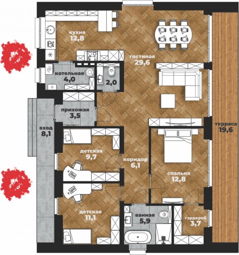 Две симметричные детские и мастер-спальня с собственной гардеробной. Просторный санузел с ванной и душевой, а так же отдельный гостевой санузел. Из п-образной кухни отдельная дверь в котельную с функцией постирочной и кладовой. А гостиную и столовую зоны освещает панорамное остекление с выходом на террасу.