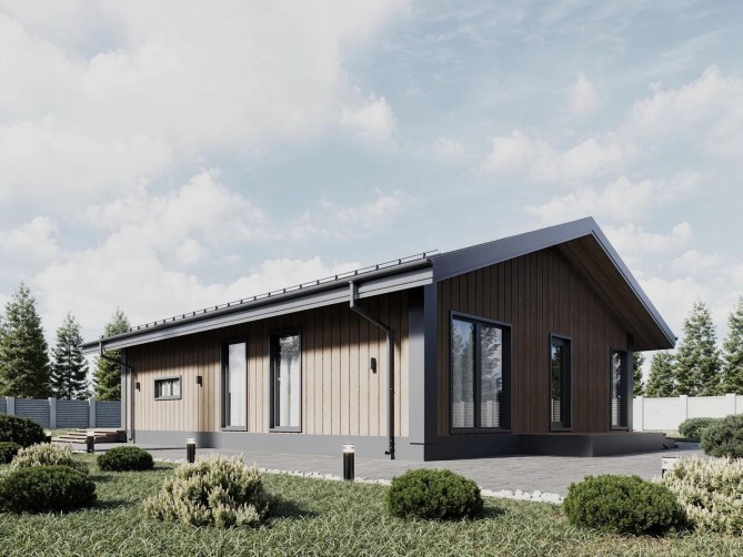 В доме просторная кухня-гостиная, две спальни, прихожая, бойлерная и отдельный санузел.