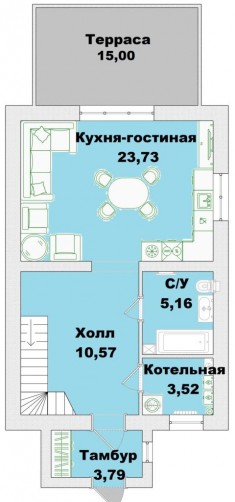 Благодаря продуманной планировке и наличию французского окна, которое наполняет помещение естественным светом и создает ощущение простора, а при желании может стать эффектным выходом на террасу, кухня-гостиная, расположенная на первом этаже, площадью 24 кв. м. становится центром притяжения всех членов семьи и гостей дома.