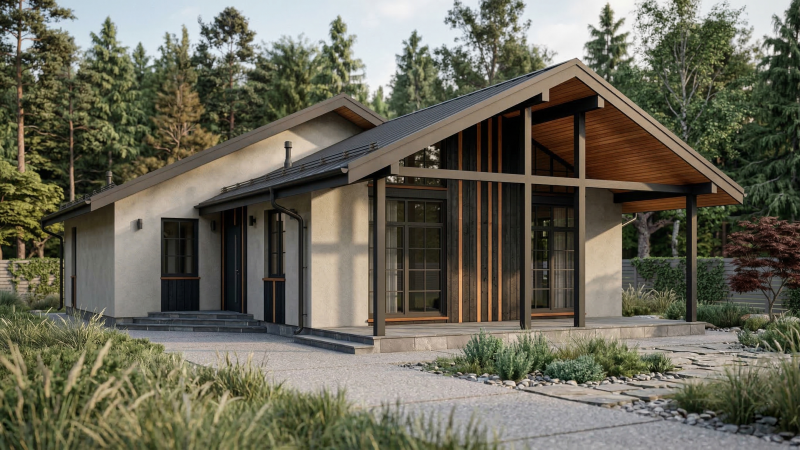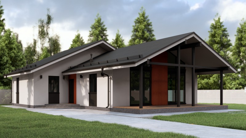 В проекте предусмотрены три спальни, просторная кухня-гостиная и два санузла. В доме главный вход смежен со входом в прачечную, также предусмотрена дверь с улицы в котельную, через которую можно пройти в прачечную и далее внутрь дома. В кухне-гостиной присутствуют понорамные окна с выходами на просторную крытую террасу.