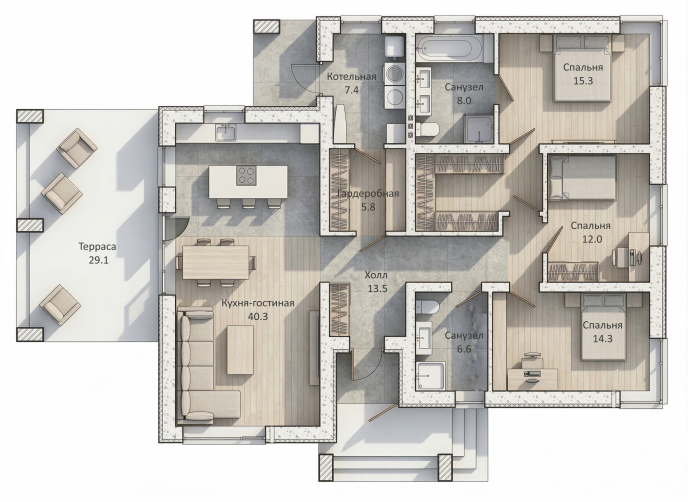 Дом вместительный и аккуратный, в проекте предусмотрены две спальни, а так же мастер- спальня с гардеробной и санузлом, общий санузел, светлая просторная кухня-гостиная с выходом на крытую террасу, котельная с отдельным входом, что отвечает современным требованиям строительных норм относительно помещений для размещения котельного оборудования.