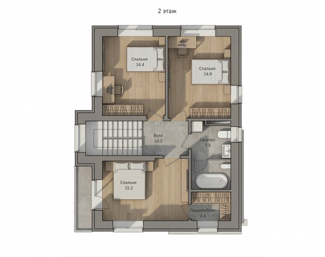 Второй этаж — приватная зона, объединяющая три спальни, одна из которых с гардеробной и балконом.