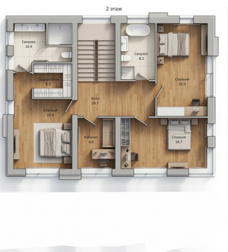 На втором этаже расположились мастер-спальня с собственной ванной комнатой и гардеробной — личное пространство родителей, две детские комнаты, общий санузел и кабинет.