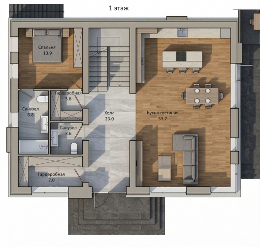 Первый этаж дома — зона с просторной кухней-гостиной с панорамным остеклением и выходом на открытую террасу. Также на первом этаже предусмотрены просторный холл с гостевой гардеробной и санузлом. Дополнительно, первый этаж включает в себя мастер-спальню, которую можно использовать для проживание родителей или гостей.