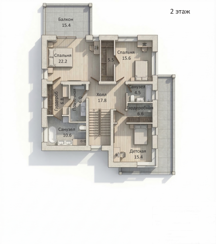 На втором этаже расположились мастер-спальня с гардеробной, собственной ванной комнатой и балконом — личное пространство родителей, две детские комнаты, общий санузел и прачечная.
